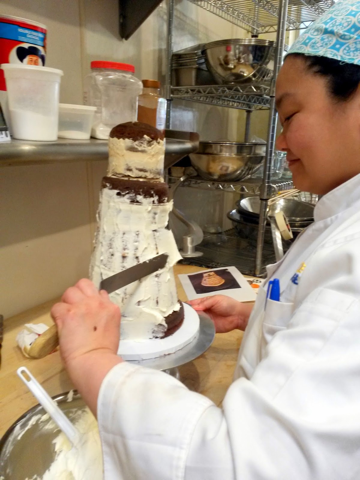 | Crumb- coating the whole thing with vanilla frosting, then a sojourn in the freezer. It was hot that Saturday! |
